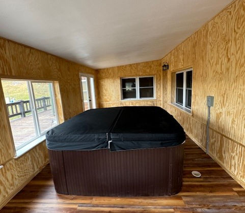 We demolished the area of deck where the hot-tub would be located, poured a 12" thick slab, and extended the framing up with 6x6 lumber to reinforce the decking. We then reinforced the bearing walls for the roof under the existing deck. It was then finished out with 100% Waterproof LVT flooring and clear sealer to protect the walls and ceilings from the excessive humidity.